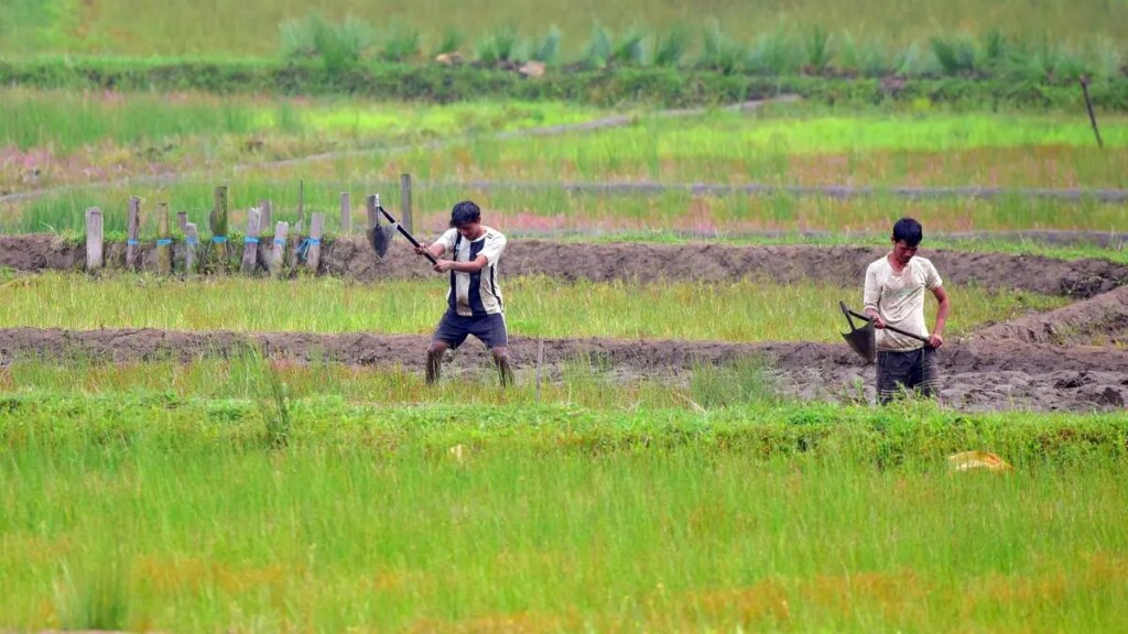 File Photo: Agricultural labourers ploughing a paddy field with traditional farming instruments, in West Khasi Hills, Meghalaya | Photo Credit: