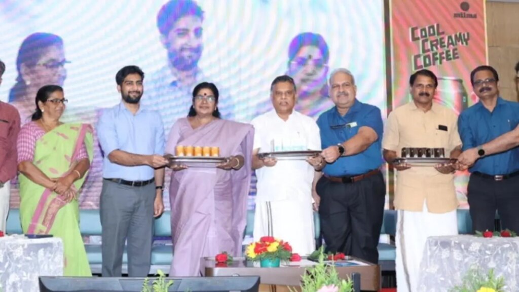 Minister for Animal Husbandry and Dairy Development, J Chinchurani, along with Milma Chairman KS Mani launching Milma’s Nutrilevel, Cold Coffee and