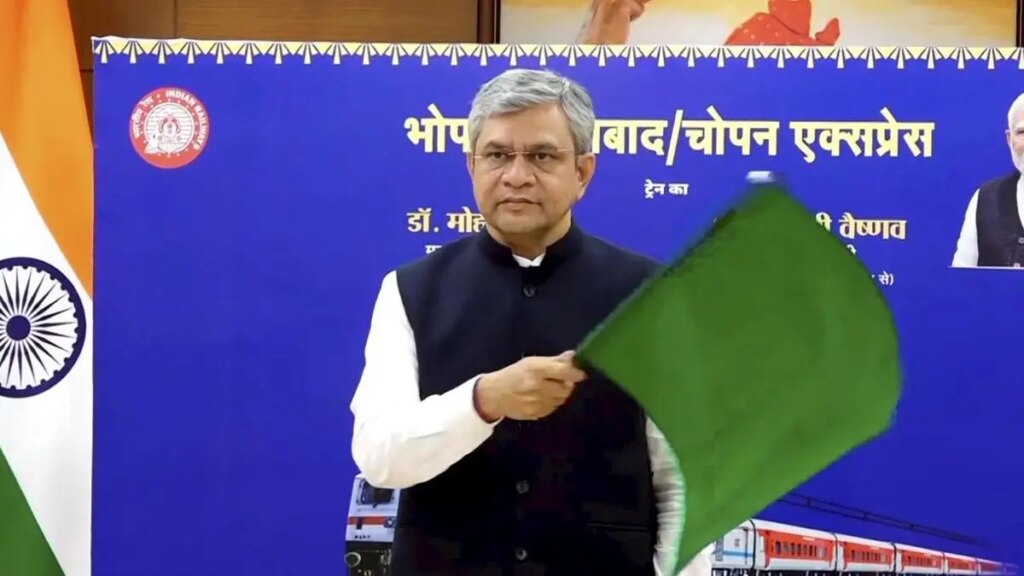 Union Railways Minister Ashwini Vaishnaw virtually flags off the Bhopal-Dhanbad and Bhopal-Chopan Express Trains, in New Delhi, Tuesday, Feb. 24,
