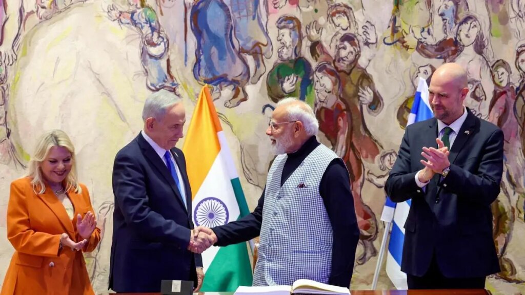 Prime Minister Narendra Modi exchanges a handshake with Israeli Prime Minister Benjamin Netanyahu at the Knesset, Israeli parliament, in Jerusalem